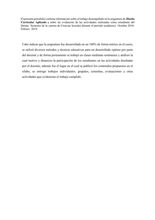 El documento describe la importancia creciente de los portafolios educativos en la evaluación de estudiantes. Explica que los portafolios permiten juzgar las capacidades de los estudiantes a través de producciones de diferentes tipos que muestran su progreso y logros en relación a objetivos de aprendizaje. Los portafolios ofrecen una visión más amplia de las competencias de los estudiantes al incluir trabajos que demuestran su pensamiento, análisis, síntesis y otras habilidades. El portafolio presentado contiene evid