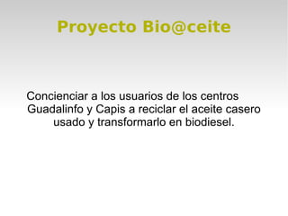 Este proyecto tiene como objetivo concienciar a los usuarios de los centros Guadalinfo y Capis sobre el reciclaje del aceite de cocina usado depositándolo en contenedores provistos en esos centros. Luego, una empresa retirará ese aceite y lo transportará a una fábrica donde será transformado en biodiesel, un combustible producido a partir de aceite usado.