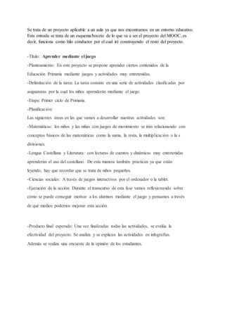 Este documento presenta un proyecto para enseñar contenidos de primaria a través de juegos y actividades entretenidas. El proyecto se centrará en matemáticas, lengua castellana y ciencias sociales para alumnos de primer ciclo de primaria. Incluirá juegos de movimiento para conceptos matemáticos, lectura de cuentos y dinámicas para el uso del castellano, y juegos interactivos en ordenador o tableta para ciencias sociales. Al final se evaluará la efectividad del proyecto y