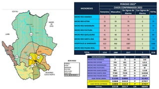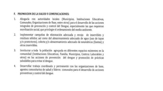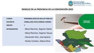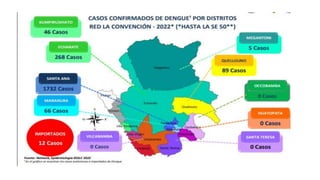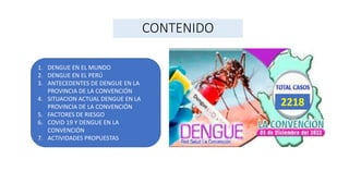 Este documento presenta información sobre el dengue en la provincia de La Convención en 2022. Explica la situación actual del dengue en el mundo, Perú y específicamente en La Convención, incluyendo factores de riesgo, antecedentes de casos y la circulación concurrente de COVID-19. También describe las actividades propuestas para la vigilancia epidemiológica, control vectorial, promoción de la salud y comunicaciones para abordar los brotes de dengue en la región.