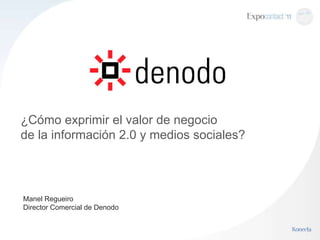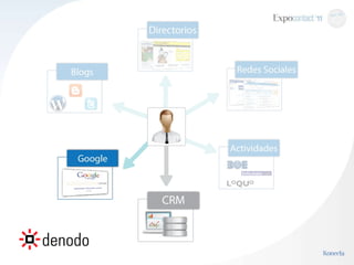 El documento describe cómo la virtualización de datos puede ayudar a las empresas a integrar y extraer información de fuentes internas y externas de forma automatizada. La plataforma Denodo permite unificar la información de clientes proveniente de sistemas dispares como redes sociales y sitios web, lo que mejora la eficiencia y la calidad de los datos disponibles para los agentes de contact center. Un caso práctico muestra cómo Denodo ayudó a una empresa a automatizar la búsqueda de datos de contacto en línea, duplicando su productividad y reduciendo cost