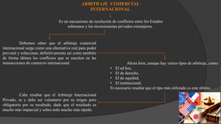 El documento trata sobre los orígenes y tipos de arbitraje comercial internacional. Explica que surgió como una alternativa para prevenir y resolver conflictos en transacciones comerciales internacionales de forma imparcial y rápida. Describe los principales tipos de arbitraje y que el más utilizado es el arbitraje institucional. Además, analiza aspectos como los acuerdos de arbitraje, el carácter voluntario pero obligatorio del proceso, y los principales centros e instituciones de arbitraje utilizados.