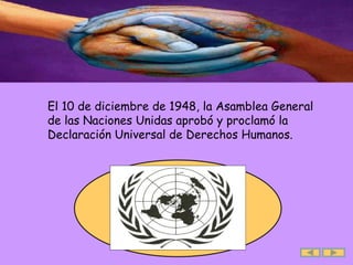 La Declaración Universal de Derechos Humanos fue aprobada por la ONU en 1948 y establece los derechos fundamentales de todas las personas, incluidos derechos civiles, políticos, económicos, sociales y culturales. El documento explica 30 artículos específicos sobre estos derechos y la responsabilidad de los gobiernos de protegerlos, desde el derecho a la vida y la libertad hasta el derecho al trabajo y la educación.