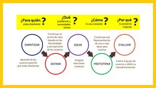 El documento describe las 5 fases del método de pensamiento de diseño (Design Thinking): 1) Empatizar, 2) Definir, 3) Idear, 4) Prototipar, 5) Evaluar. La primera fase involucra aprender sobre los usuarios finales, la segunda identifica sus necesidades y problemas, la tercera genera ideas para resolverlos, la cuarta crea prototipos, y la quinta obtiene retroalimentación de los usuarios.