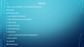 El documento analiza el impacto de las redes sociales en los jóvenes, destacando sus beneficios y riesgos asociados, incluidos problemas de adicción y efectos negativos en la salud mental. Se subraya la importancia de un uso controlado y consciente de estas plataformas, así como el papel de padres y educadores en la supervisión del uso de la tecnología. También se mencionan estadísticas sobre el consumo de redes sociales y la necesidad de estar informado sobre sus riesgos y beneficios.