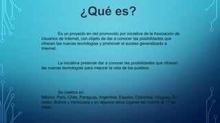 El Día de Internet es un evento anual celebrado el 17 de mayo para promover el acceso a Internet. Se lleva a cabo en varios países de Latinoamérica, España y otros lugares, con el objetivo de dar a conocer las posibilidades de las nuevas tecnologías. Durante este día se realizan diversos eventos y actividades organizadas por empresas y organizaciones para acercar Internet a quienes no están conectados.
