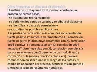Un diagrama de dispersión representa gráficamente la relación entre dos variables, permitiendo analizar cómo los valores de una variable dependiente varían en función de los valores de una variable independiente. El análisis de un diagrama de dispersión implica elaborar una teoría, obtener pares de datos, e identificar el patrón de correlación entre las variables para estudiar posibles explicaciones de la relación.