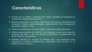 Canva es una plataforma online para diseño gráfico desarrollada en 2012 que ofrece herramientas para crear presentaciones, infografías, videos y más. Prezi es una herramienta para presentaciones que permite crear presentaciones en línea de diapositivas en minutos y luego publicarlas para que otros puedan verlas u descargarlas. Google Docs es un procesador de texto en línea que permite crear y editar documentos de forma colaborativa en tiempo real desde cualquier dispositivo con acceso a Internet.