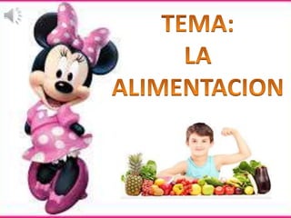 Este documento describe los diferentes tipos de alimentos que componen una dieta saludable, incluyendo alimentos de origen vegetal como frutas, raíces, tallos y hojas de plantas, alimentos de origen animal como carnes y alimentos de origen mineral. Explica que los alimentos de origen vegetal y animal proporcionan vitaminas y energía que promueven un crecimiento sano y fuerte. También menciona que debemos evitar ciertos alimentos no saludables.