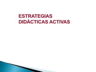 Este documento presenta diferentes estrategias didácticas activas como la lluvia de ideas, los juegos de roles, la lotería y el debate. Describe los objetivos, las actividades del instructor y del participante, así como los materiales necesarios para cada estrategia. El instructor guía el aprendizaje de manera activa y colaborativa, mientras que los participantes desarrollan habilidades a través de la discusión, la simulación de roles y la resolución colaborativa de problemas.