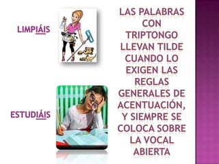 El documento aborda las vocales en español, diferenciando entre vocales cerradas (i, u) y abiertas (a, e, o). Se explican las reglas de acentuación para diptongos e hiatos, destacando que los hiatos se producen en sílabas diferentes. Además, se mencionan los casos específicos de acentuación según la combinación de vocales.