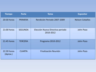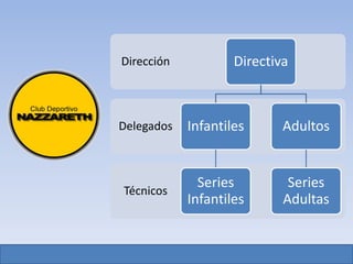 Este documento presenta una propuesta de directiva y estructura organizacional para el Club Deportivo Nazzareth para los años 2010-2012. Propone a John Pozo como presidente y lista objetivos como ser el club más importante de la localidad, actualizar la lista de socios, mejorar la transparencia, y potenciar la comunicación y las iniciativas deportivas y recreativas del club.
