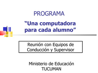 El documento describe el programa "Una computadora para cada alumno" del Ministerio de Educación de Tucumán. El programa busca incorporar las TIC en las escuelas técnicas y agrotécnicas de la provincia, entregando computadoras a los estudiantes y docentes. La implementación incluye capacitar a los equipos directivos, docentes y formadores en el uso pedagógico de las tecnologías durante 2010.