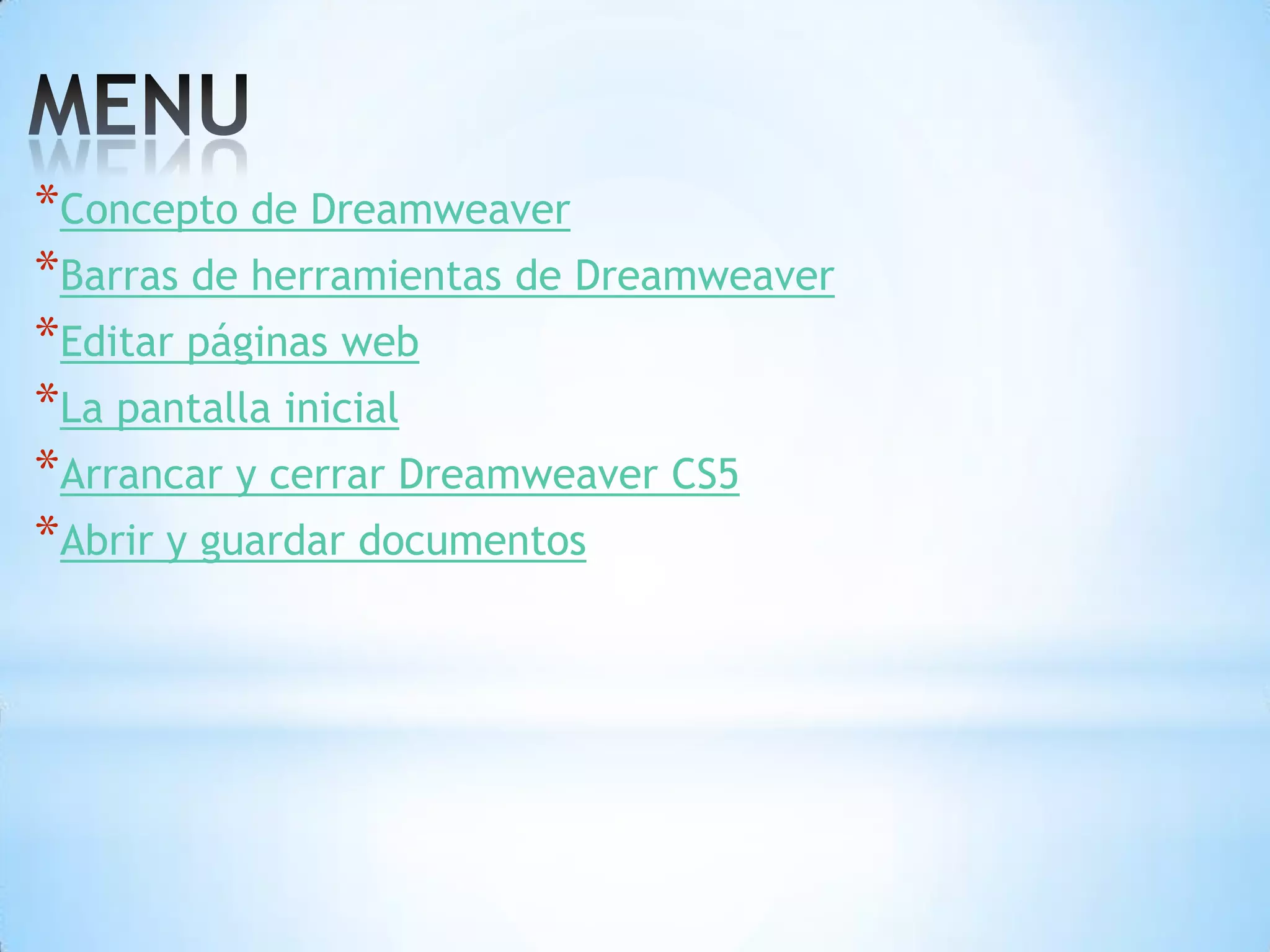 Dreamweaver es un software para crear y editar páginas web de forma visual sin necesidad de codificar manualmente. Ofrece barras de herramientas para alternar entre vistas del documento y editar elementos como tablas y comportamientos JavaScript. Se puede abrir y guardar documentos individualmente o todos a la vez.