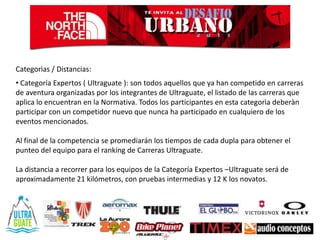 The North Face Desafío Urbano es un rally pedestre en la ciudad de Guatemala que recorre áreas emblemáticas, destinado a promover habilidades motoras y conocimiento sobre la cultura guatemalteca. Existen dos categorías, expertos y novatos, que recorrerán distancias de 21 km y 12 km respectivamente, incluyendo una serie de pruebas y actividades. Las duplas ganadoras recibirán premios y se realizarán sorteos entre todos los participantes.