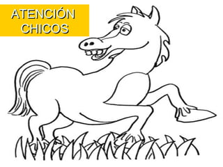 Este documento presenta una presentación educativa interactiva con preguntas y respuestas sobre el color del caballo blanco de Santiago. Contiene imágenes, sonidos e hipervínculos, y guía a los estudiantes a leer las preguntas detenidamente para responder correctamente.