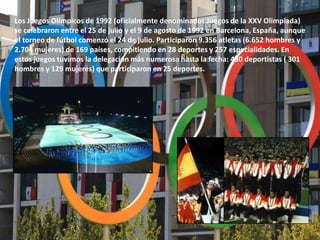 Los Juegos Olímpicos de Barcelona 1992 se celebraron del 25 de julio al 9 de agosto en la ciudad anfitriona. Participaron más de 9,000 atletas de 169 países en 28 deportes. La antorcha olímpica recorrió más de 6,000 km a través de España. Las instalaciones deportivas y la infraestructura de Barcelona se mejoraron para acoger los Juegos.