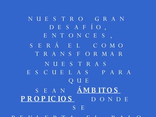Este documento propone transformar las escuelas para revertir el bajo rendimiento y ausentismo de los estudiantes y mejorar la convivencia escolar, recuperando estrategias exitosas e incorporando nuevas que promuevan el protagonismo y la autogestión de los alumnos. Los objetivos son brindar espacios para la expresión artística, deportiva y recreativa, mejorar la relación con el aprendizaje, y ampliar las perspectivas laborales de los estudiantes. Se espera lograr una disminución de la deserción y repitencia,