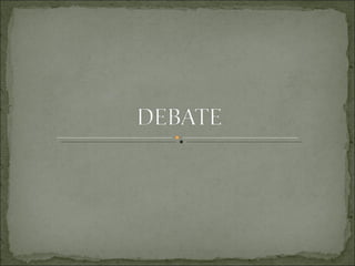 El documento describe las características y pasos básicos para realizar un debate. Explica que un debate es una discusión de opiniones antagónicas sobre un tema entre dos o más personas sin aportar soluciones. Detalla que se debe elegir un tema controvertido, un moderador, formar grupos a favor y en contra, y establecer roles como moderador para controlar el tiempo y secretario para tomar nota. Además, enfatiza la importancia de que los participantes se preparen adecuadamente sobre el tema.