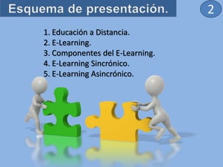 Este documento presenta una introducción al tema de E-learning. Se define E-learning como una modalidad educativa que utiliza las tecnologías de la información y comunicación para facilitar el aprendizaje, permitiendo la flexibilidad en cuanto a espacio y tiempo. Se describen los componentes del E-learning como contenidos, herramientas de apoyo, tutoría y aprendizaje colaborativo. Además, se diferencian las modalidades sincrónica y asincrónica, siendo la primera aquella en la que la interacción ocurre en tiempo real y la segunda cuando