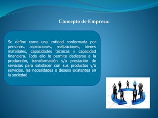 El documento describe los diferentes tipos de empresas según su sector de actividad, actividad económica, tamaño, propiedad del capital y forma jurídica. También explica la relación entre la empresa y la administración, definiendo la administración como responsable de la planeación, organización, control y evaluación de la empresa. Por último, introduce los conceptos de calidad total y la importancia de satisfacer las necesidades de los clientes para una empresa.