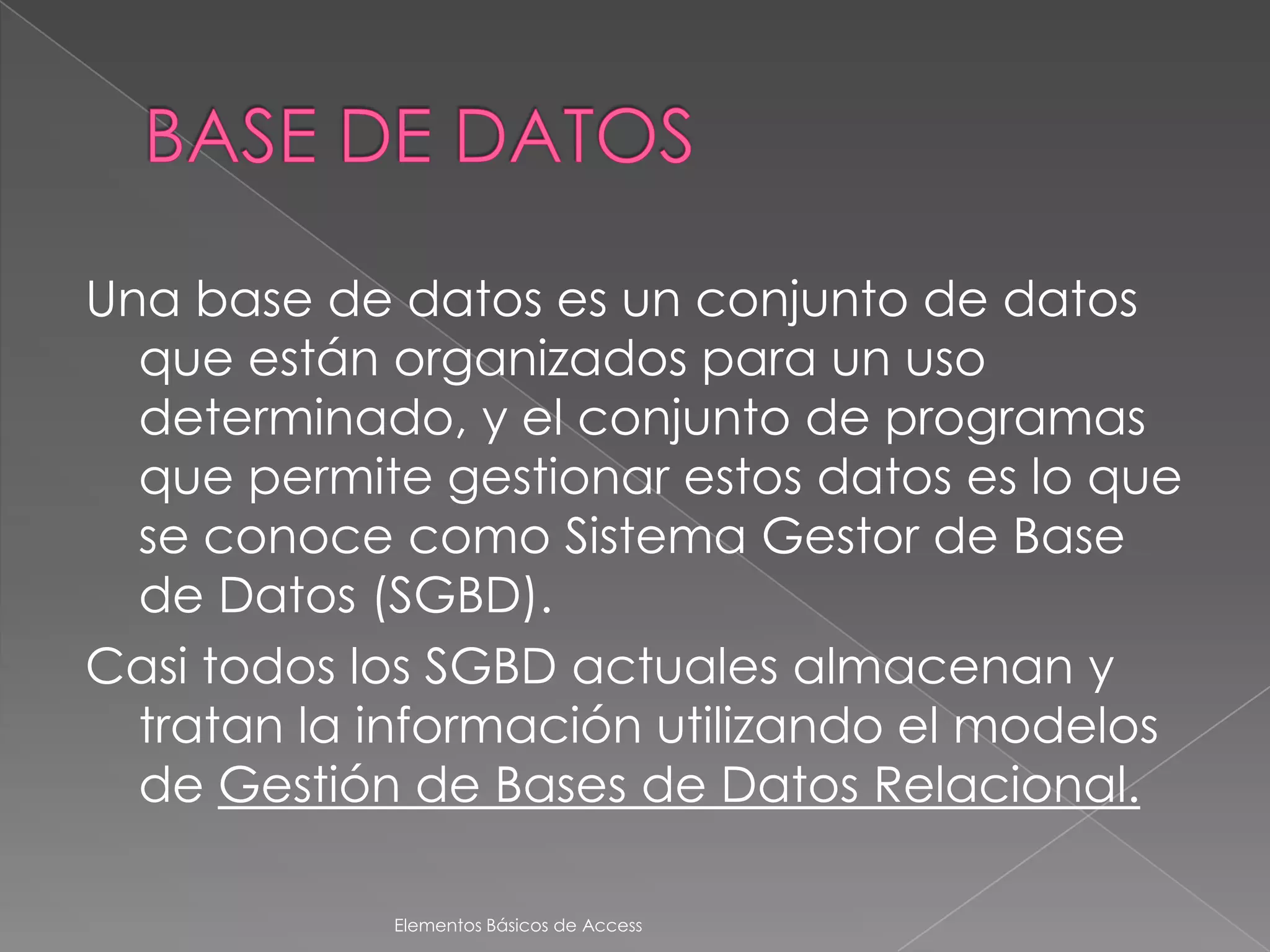 Este documento describe los elementos básicos de una base de datos en Access, incluyendo tablas para almacenar datos en campos y registros, consultas para extraer datos de las tablas, formularios para introducir y modificar datos, informes para presentar datos de forma impresa, y macros e índices para definir acciones y buscar registros respectivamente.