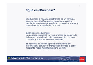 El documento describe qué es el eBusiness y sus ventajas, destacando su crecimiento como alternativa a los negocios tradicionales, especialmente en el comercio internacional. Se enfoca en los mercados electrónicos (eMarketplaces) y sus tipos, así como los beneficios y desventajas de los mercados centrados en compradores y vendedores. Además, se menciona el proyecto Emarket Services, que busca ayudar a las empresas a expandirse utilizando mercados electrónicos.