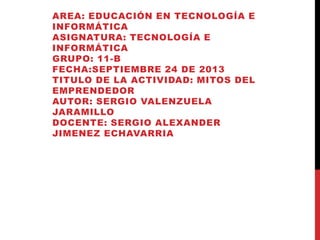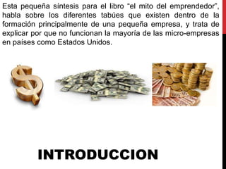 Este documento resume un libro llamado "El mito del emprendedor". Explica que muchas microempresas no tienen éxito debido a mitos comunes. Discutió que el 40% de las nuevas empresas ya no existen después de un año. También describe un proceso sistemático para desarrollar con éxito un nuevo negocio siguiendo pasos específicos y minimizando errores. Concluye que el libro no garantiza el éxito de los negocios por sí solo, sino que las personas deben aprender de las experiencias descritas para poder emp