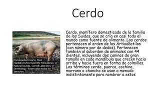 El documento presenta información sobre diferentes animales de granja como cerdos, vacas, ovejas, caballos, patos, conejos, gallinas, burros, perros, pavos, pollos, ratones y cabras. Describe sus características físicas, su clasificación taxonómica y su relación con el ser humano.
