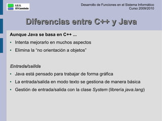 Este documento presenta conceptos clave de Java como entrada/salida, tipos de datos, funciones y paso de parámetros. Explica las diferencias entre Java y C++ en estas áreas y proporciona ejemplos de declaración de variables, constantes y vectores en Java.