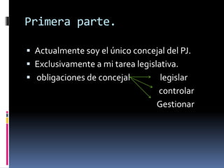 El documento describe las funciones y proyectos de un concejal del partido justicialista. Menciona sus obligaciones legislativas como concejal, sus colaboradores y proyectos presentados en áreas como vivienda, estadísticas, educación vial, reanimación cardiopulmonar y reconocimientos a jóvenes talentos y empresas socialmente responsables.