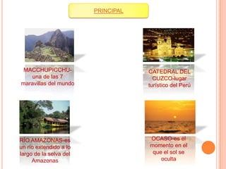 Este documento habla sobre objetos comunes en PowerPoint como imágenes, wordart, formas y sus propiedades. También menciona algunos lugares notables del Perú como Machu Picchu, la Catedral del Cuzco y el río Amazonas, así como frases célebres sobre la naturaleza, el conocimiento y el agua.
