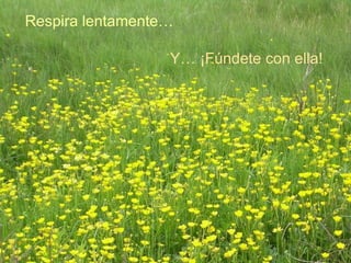 El documento recomienda salir al aire libre para conectarse con la naturaleza, relajarse y sentirse bien consigo mismo. Sugiere respirar lentamente, escuchar a los pájaros cantar, sentir la brisa y el agua, y dejar que el tiempo pase tranquilamente para inventar una nueva realidad y relajarse.