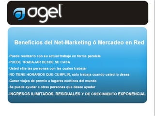 El net-marketing o mercadeo en red es un sistema de comercialización de productos que permite desarrollar un negocio rentable y fácil sin intermediarios, utilizando la publicidad boca a boca para obtener ganancias de por vida sin jefes, horarios o personal a cargo.