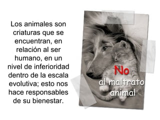 Los animales se encuentran en un nivel de inferioridad en la escala evolutiva y dependemos de nosotros para garantizar su bienestar. El maltrato animal incluye negligencia, sufrimiento y estrés innecesarios. Las granjas industriales reemplazan los pastizales naturales con jaulas y sistemas de encierro que privan a los animales de su bienestar. El trato cruel a las gallinas y la pesca industrial amenazan la supervivencia de especies. Los circos someten a animales a condiciones duras desde su captura hasta