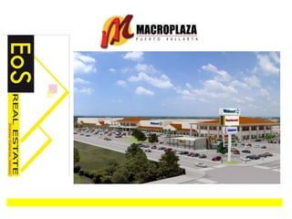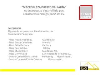 El documento describe el proyecto "Macroplaza Puerto Vallarta", un centro comercial desarrollado por Constructora Planigrupo en Puerto Vallarta, Jalisco. La Macroplaza tendrá un área de 98,750 metros cuadrados con tiendas ancla como Wal-Mart, Muebles América y Autozone, así como 228 locales comerciales y 1,853 cajones de estacionamiento. Se construirá respetando la vegetación local y abrirá en tres etapas entre marzo y noviembre de 2010.