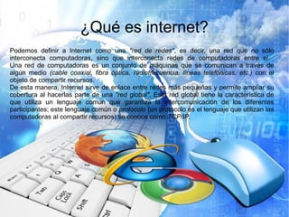Internet comenzó como una red de redes diseñada para permitir la comunicación entre usuarios de computadoras. En la década de 1960, J.C.R. Licklider propuso la idea de una Red Galáctica y el desarrollo de la conmutación de paquetes permitió la interconexión eficiente de redes. En la década de 1990, la World Wide Web se popularizó y surgieron los primeros buscadores como Archie, Wais y Gopher para organizar los recursos en Internet.