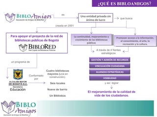 Bibloamigos es una organización sin ánimo de lucro en Bogotá, creada en 2001, que mejora el acceso a bibliotecas públicas y promueve la cultura y lectura. Ofrecen servicios de alquiler de espacios para eventos en diversas bibliotecas, cuyos ingresos se reinvierten en proyectos de fomento a la lectura y adquisición de libros. Los costos del alquiler se detallan y deben incluir un IVA del 10%, además de requerir un anticipo para la reserva del espacio.