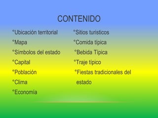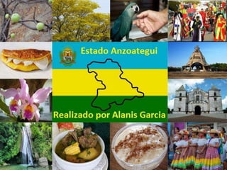 El documento proporciona información sobre el estado de Anzoátegui en Venezuela. Ubicado en la costa noreste, limita con otros estados y el Mar Caribe. Su capital es Barcelona y su población es de aproximadamente 1.7 millones de habitantes. La economía se basa en la industria, la pesca, el turismo y la agricultura. Algunas fiestas tradicionales incluyen danzas con cintas y su comida típica es el pastel de morrocoy.