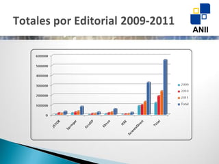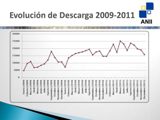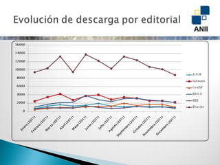 El documento muestra el número total de artículos descargados de varias bases de datos entre 2009 y 2011. ScienceDirect fue la base de datos más utilizada con más de 300,000 descargas en total, seguida de Springer con más de 80,000 descargas. La base de datos con menos uso fue JSTOR con poco más de 30,000 descargas durante el período de tres años.
