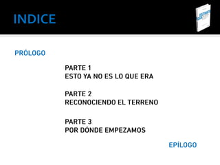 El documento presenta un resumen de 10 capítulos sobre estrategia digital y marketing en redes sociales. Los capítulos discuten temas como el surgimiento de nuevos mercados online, el papel creciente de las redes sociales, el concepto de "comuniting" que une comunidades y marcas, y diferentes modelos y formatos de software social. También se analizan estrategias internas como conocer las fortalezas y debilidades de una empresa, y estrategias externas como la captación y fidelización de clientes digitales. El documento concluye con conse