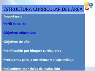 Este documento presenta la estructura curricular del área de Estudios Sociales. Describe la importancia de enseñar esta área, sus objetivos educativos, los ejes de aprendizaje y las macrodestrezas. Además, detalla los temas que se abordarán en cada grado desde 4to a 10mo, organizados en bloques curriculares, y especifica los objetivos educativos para cada año. Finalmente, presenta el perfil de salida esperado para los estudiantes al completar la Educación General Básica.