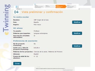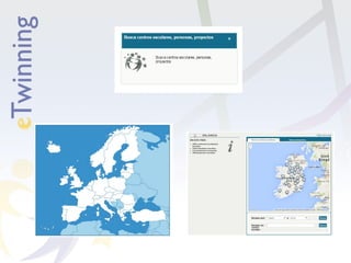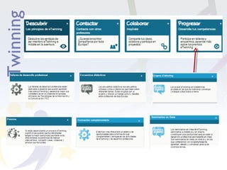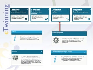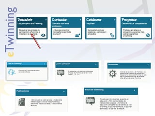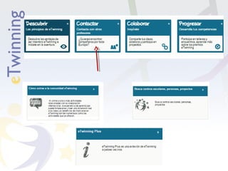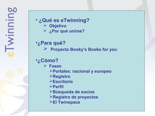 eTwinning es una comunidad en línea para escuelas europeas que permite a docentes y estudiantes colaborar en proyectos educativos a través de Internet. El documento describe qué es eTwinning, para qué sirve y cómo participar, incluyendo cómo registrarse, buscar socios, crear proyectos y usar el espacio virtual Twinspace. También presenta un ejemplo de proyecto donde estudiantes de Portugal y Polonia crearon libros en inglés para estudiantes de primaria.
