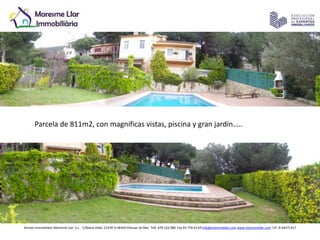 El documento anuncia la venta de una casa de 4 vientos con 811 metros cuadrados de parcela, piscina y gran jardín en Cabrils por 445.000€. La casa tiene salón comedor, cocina, 3 habitaciones y un baño en la planta principal, una suite en la primera planta y una sala polivalente en la planta inferior. La propiedad ofrece privacidad en un entorno natural con vistas y riego automático. Se proporciona información de contacto para más detalles.
