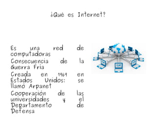 El documento describe la evolución de Internet y la Web a través de cinco generaciones. La Web 1.0 consistía en sitios de uno a muchos con información estática. La Web 2.0 introdujo plataformas colaborativas como blogs y redes sociales que permitieron la interacción entre usuarios. La Web 3.0 busca agregar inteligencia semántica mediante etiquetado de contenido. La Web 4.0 predicciones incluyen realidad aumentada y acceso neuronal directo. La Web 5.0 permitirá la inserción de videos e imágenes interactivas