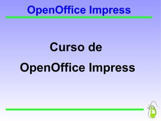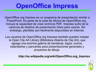 OpenOffice Impress es un programa de presentaciones similar a PowerPoint que forma parte de la suite de oficina libre OpenOffice.org. Permite crear presentaciones y archivos PDF e incluye plantillas y una galería de elementos gráficos. Explica cómo crear y formatear diapositivas, agregar objetos, animaciones y efectos de transición entre diapositivas.