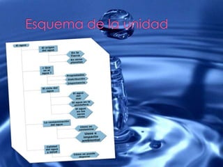 El documento describe el origen y propiedades del agua en la Tierra. El agua se formó a partir de los gases liberados durante la formación del planeta y es esencial para la vida. El agua se encuentra en los océanos, la atmósfera y los seres vivos en forma líquida, sólida y gaseosa como parte del ciclo del agua. La contaminación humana amenaza la calidad del agua y la salud.