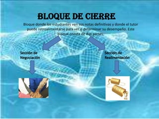 El documento describe el bloque de cierre de un programa de e-learning, el cual consta de dos secciones: la sección de negociación, donde los estudiantes pueden negociar sus notas y solicitar certificados de graduación, y la sección de retroalimentación, donde los estudiantes proveen comentarios sobre el curso y el desempeño del tutor para mejoras futuras.