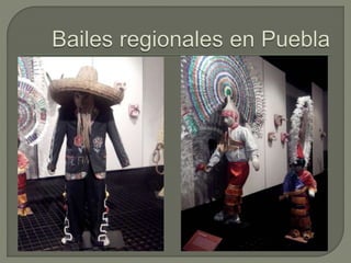 El documento describe la geología, vegetación y diversas culturas indígenas que existieron en los estados de Puebla y Tlaxcala, incluyendo los popolocas, mixtecos, tepehuas, mazatecos, nahuas, totonacos y otomíes. También habla sobre la fundación planificada de la ciudad de Puebla en 1531, la introducción de la talavera por monjes, importantes eventos históricos como la batalla del 5 de mayo de 1862 y el inicio de la Revolución Mexicana, y la identidad cultural