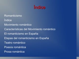 Este documento describe el movimiento romántico en España, incluyendo sus características principales, como la libertad, el genio y la inspiración individualista. Explica que el romanticismo en España se desarrolló en dos etapas, una primera romántica y una segunda posromántica, con autores de ideologías liberales y conservadoras. También resume los géneros principales del romanticismo español como el teatro romántico, la poesía narrativa y la prosa histórica.